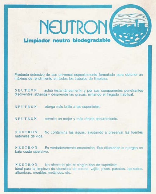 Limpiadores industriales: Producto detersivo de uso universal, especialmente formulado para obtener un máximo de rendimiento en todos los trabajos de limpieza. Limpiadores neutros biodegradables que actúan instantáneamente y por sus componentes penetrantes disuelven, ablandan y desprenden las grasas evitando el fregado habitual. Sus diluciones otorgan un bajo costo operativo. Neutron es verdaderamente económico y muy útil en todo tipo de industria.