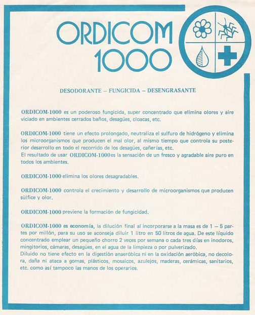 Fungicidas Bactericidas: Productos súper concentrados que eliminan olores y aire viciado en ambientes cerrados, desagües , cloacas, baños públicos, etc. Tiene un efecto prolongado que neutraliza el sulfuro de hidrógeno y elimina los microorganismos que producen el mal olor. Al mismo tiempo controla el posterior desarrollo en todo el recorrido de los desagües, cañerías, etc. El resultado de usar Ordicom 1000 es la sensación de un fresco y agradable aire puro en todos los ambientes, previniendo la formación de fungicidad.