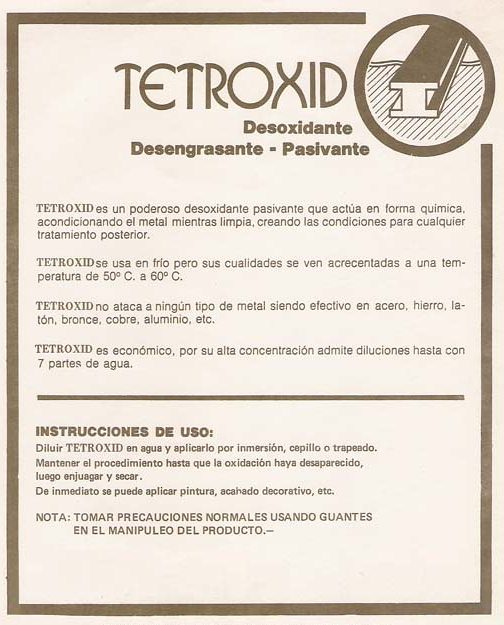 Desoxidantes: De excelente poder desoxidante, anula el óxido de piezas ferrosas, eliminándolo por completo. Deja la pieza protegida con fosfatizantes y pasivantes. Especialmente formulado deja sobre la superficie una película de fosfato de hierro